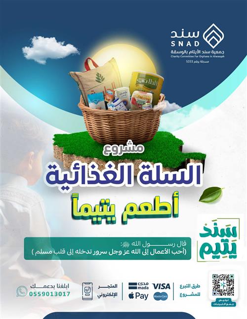 قال تعالى: {ويطعمون الطعام على حبه مسكينا ويتيما وأسيرا * إنما نطعمكم لوجه الله لا نريد منكم جزاء ولا شكورا * إنا نخاف من ربنا يوما عبوسا قمطريرا * فوقاهم الله شر ذلك اليوم ولقاهم نضرة وسرورا} [سورة الإنسان: 8-9]. بتبرعك نوصل سلة غذائية شهرية للأيتام.